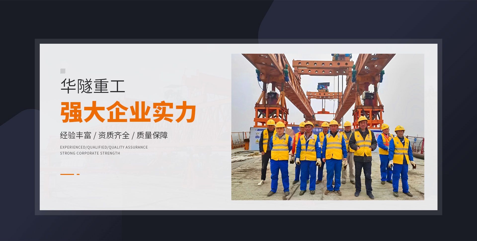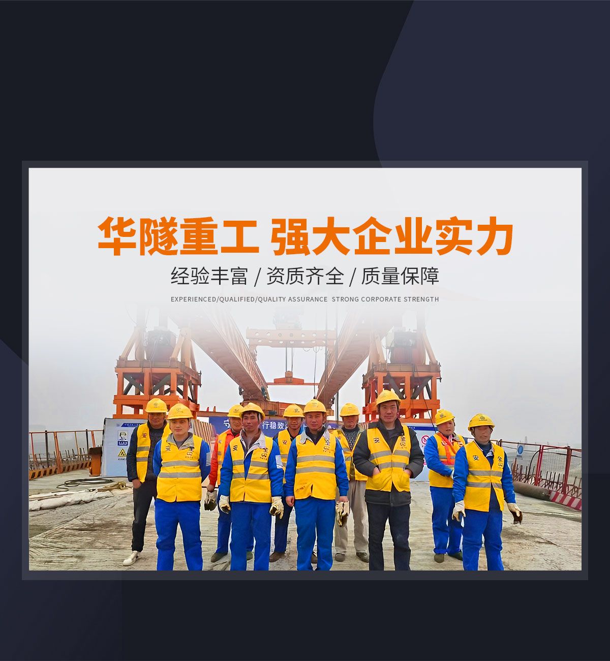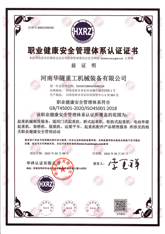 河南華隧重工機械裝備有限公司主要從事通用門式起重機、橋式起重機、電動單梁起重機,輪胎式起重機、架橋機、提梁機、遠梁平車、鋼絲繩電動萌蘆、卷揚機、起重配件制造、銷售:起重機械租賃、安裝和維修,起重設備園收,機械設備維修,鋼結構工程承包,橋梁工程及技術咨淘服務,銷售五金制品、機電設備:建設工程監理,建設工程設計,各類工程建設活動,建筑勞務分包,建筑物折除作業,施工作業,工程管理服務,土石方工程施工,裝如發運?! 」疽淹ㄟ^IS0國際質量、環境、健康與安全三合一標準認證,特種設備制造許可證和特種設備安裝改造維修許可證。擁有完熟的質量管理體系。嚴格的管理制度,強大的生產能力和先進的檢測手段,在保證產品質量的同時,也具備了極強的市場競爭力。  公司堅持科技創新為理念,產品質量為核心,注重信譽,建立了減信可靠、快捷、思速。便利周到的售后服務網絡。  我們擁有的技術專家和技術服務隊伍為客戶提供充善的售前技術支持和全天候的售后服務體系,讓您無后顧之憂,享受一站式的超值服務。  “華隧重工,伴您成功“是華隧重工永遠的宗指,真被的希望與各界朋友攜手并進。共創輝準!
